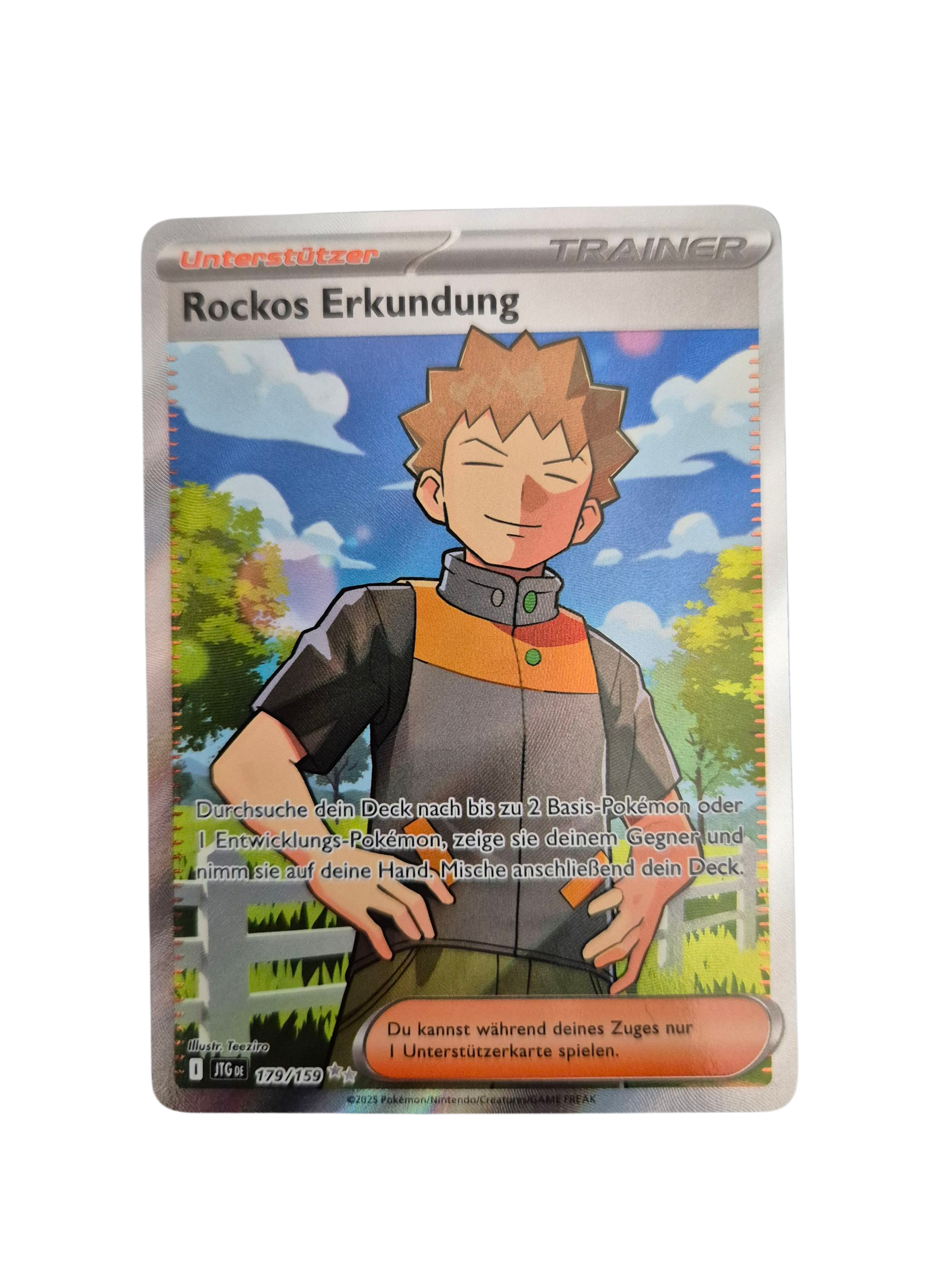 Die Pokémon Karte Rockos Erkundung aus dem Set Reisegefährten ist eine Ultra Rare (UR) und zeigt den beliebten Arenaleiter Rocko aus der Kanto-Region in einem hochwertigen Full-Art-Design. Trainerkarten wie diese sind nicht nur spielstark im Pokémon TCG, sondern zählen auch zu den gefragtesten Sammlerstücken, da sie ikonische Charaktere des Pokémon-Universums präsentieren.